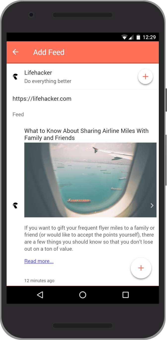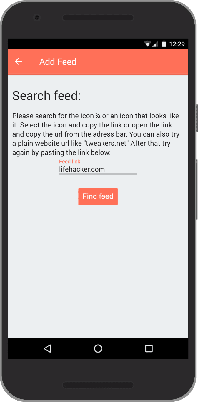 Let's try to find a custom feed on a website. Note that not all websites have these, and their might be a good chance the app will not be able to find one. If the app can't find a feed, you can always search google to find an RSS (or Atom) feed. As the app will also recognize these. For example the app cannot find a google news feed ("news.google.com"), but after a simple google search you will find that "news.google.com/rss" does work.